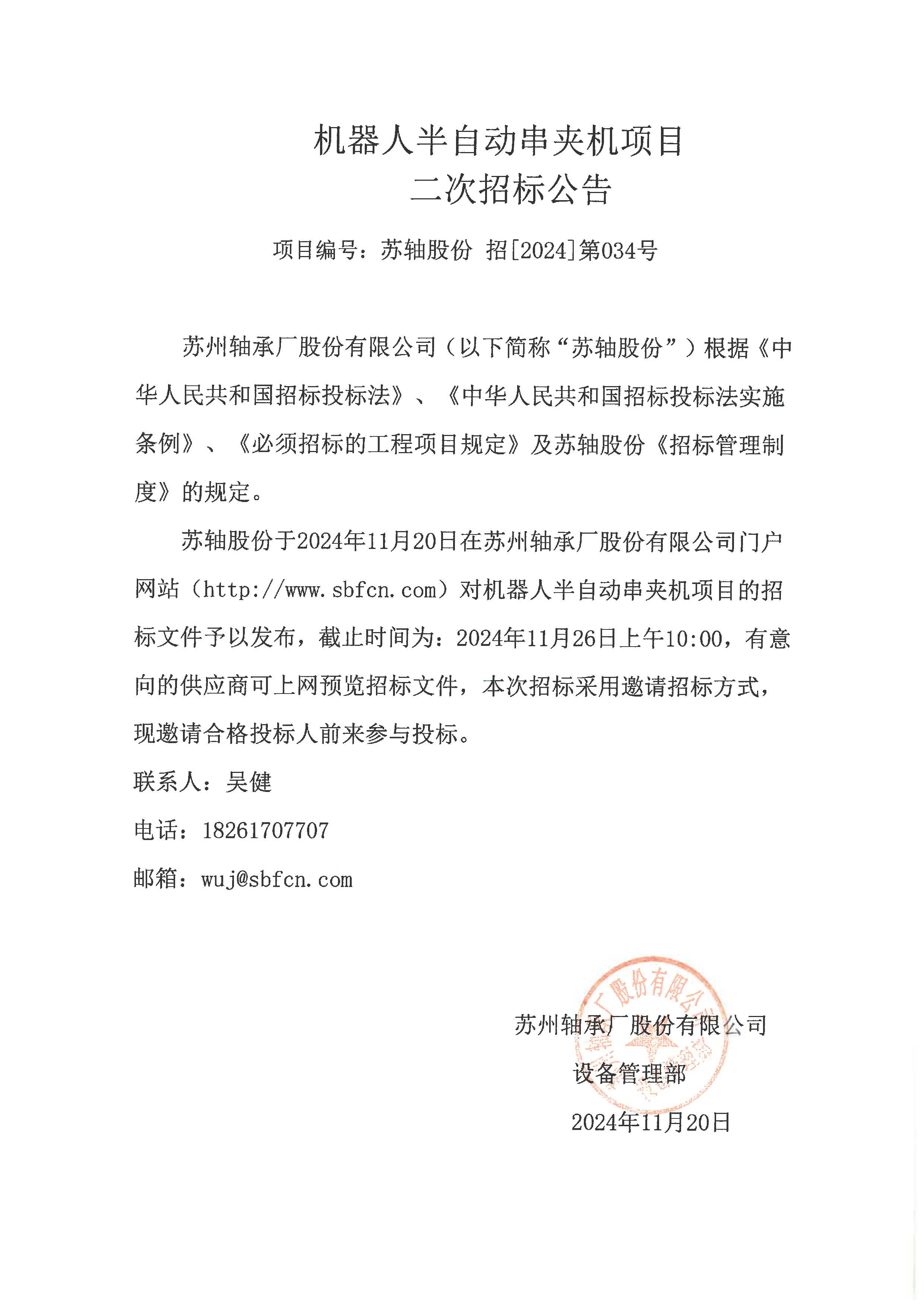 (招標(biāo))機器人半自動串夾機項目招標(biāo)二次公告
