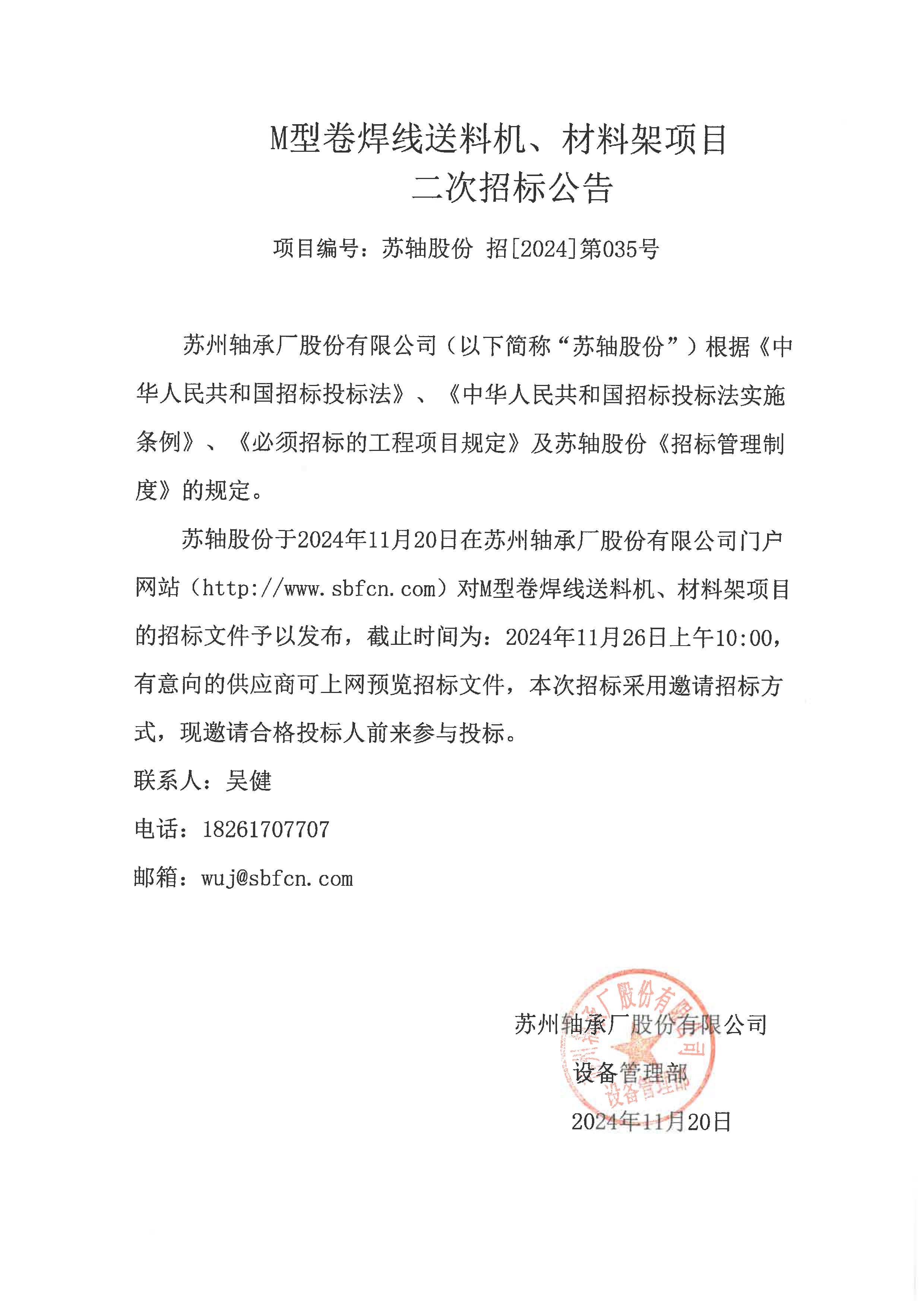 (招標(biāo))M型卷焊線送料機、材料架項目招標(biāo)二次公告